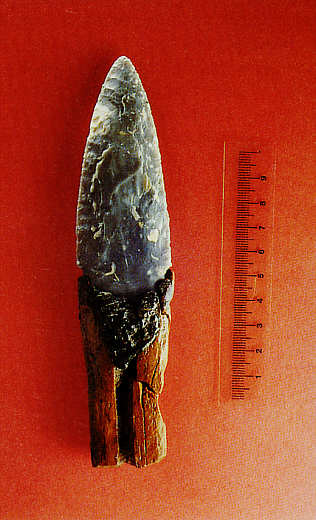 Feuersteindolch, mit Birkenteer in der Halterung verklebt, 16