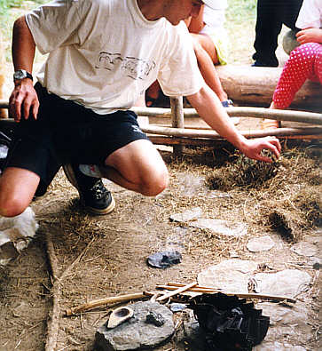 Auf die Glut wird dann trockenes Heu, Moos, Zunderschwamm oder anderes leicht entflammbares Material gelegt.