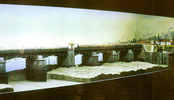 Modell der Steinpfeilerbrücke von Heidelberg (um 200 n. Chr.) Mit ihr überquerte die römische Fernstraße von Mainz/Worms über Ladenburg nach Cannstatt/Augsburg und Baden-Baden den Neckar.