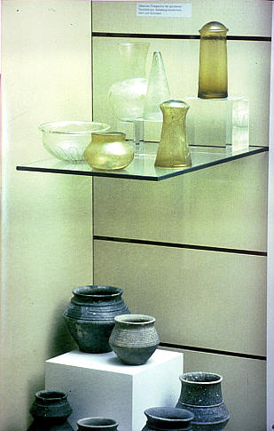 Oben neben Schüsseln aus klarem Glas drei Sturzbecher aus grünlichem Glas, die nur ausgetrunken auf dem oberen Rand (ungestürzt) abgestellt werden konnten. Unten schwarzgebrannte Keramik.