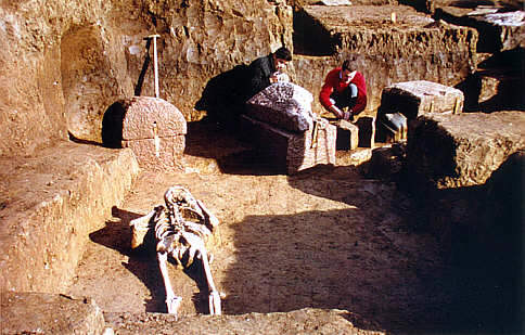 Hintergrund drei Steinkistengräber, davor ein Körpergrab.