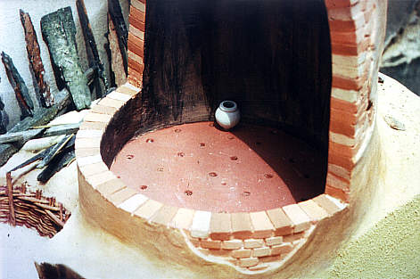 Modell eines römischen Töpferofens: Die Brennkammer ist geöffnet, die heiße Luft aus der darunterliegenden Feuerkammer strömt durch die Löcher im Boden der Brennkammer.