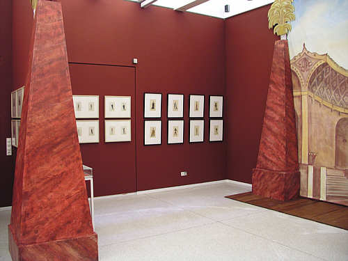 Kurpfälzisches Museum: Durch Kulissen-Obelisken abgeteilte Folge von Kostümentwürfen zu Mozarts Zauberflöte
