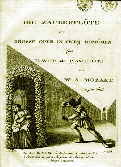 Titelseite des Klavierauszuges von Mozarts Zauberflöte, Teil 2, Pamina und Monostatos (II, 7), Radierung von Carl Christian Glaßbach, Berlin, Hummel 1792/93 (Frankfurt am Main, Universitätsbibliothek)