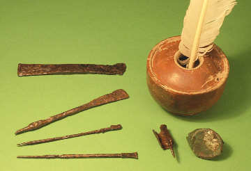 Vom Schreiben auf Papyrus oder Pergament zeugen zylindrische Fässchen aus feinem Ton oder aus Bronzeblech. Sie nahmen die Tinte (atramentum) auf, die meist aus Holzkohlenruß, gummi arabicum und weiteren Zutaten gemischt wurde. Das gängige ‚Notizbuch' für den alltäglichen Gebrauch bestand aus zwei- oder dreiteiligen, zusammenklappbaren Holztäfelchen. In die mit einem Rahmen versehenen Flächen wurde geschwärztes Wachs gestrichen, das mit einem metallenen Griffel (stilus) beschrieben wurde. Wollte der Schreiber das Eingeritzte korrigieren oder löschen, wendete er den stilus und glättete die Wachsschicht mit dem spatelförmigen Ende. In Heidelberger Gräbern kommen bis zu drei stili als ‚Schreibset' vor. Die Schreibwerkzeuge sind damit sowohl in Männer- wie in Frauenbestattungen der Heidelberger Nekropole vergleichsweise häufig vertreten. Eine erst kürzlich restaurierte und wissenschaftlich ausgewertete Auswahl zeigt das Kurpfälzische Museum der Stadt Heidelberg als "Kunstwerk des Monats" im November.