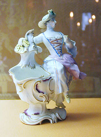 Mädchen in Mieder, Rock und Schürze vor einem Becken mit Rocaille-Dekoration