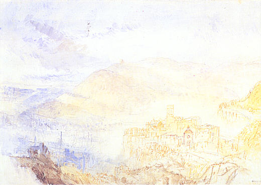 Heidelberg von Süden aus gesehen, 1844. Turner hat als Blickpunkt eine Stelle oberhalb des Schlosses am Gaisberg gewählt und hat den Torturm im Blick. Rechts am Bildrand die Terrassenmauer des Schloßgartens, links die Altstadt. Im Hintergrund der Heiligenberg |
