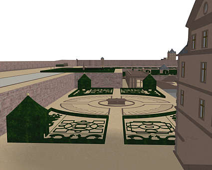 Blick von Norden über die Scheffelterrasse nach Süden (zum Königstuhl-Hang). In der Bildmitte die Orangerie und die Terrasse des Irrgartens.