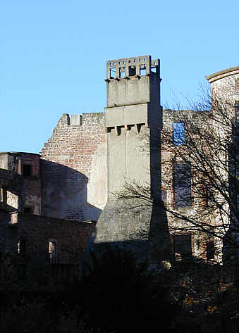 Bild unten: Der Rauchfang im Bereich des ehemaligen Zwingers, dahinter die Südwand des Ottheinrichbaus und der Ansatz des Apothekerturms.