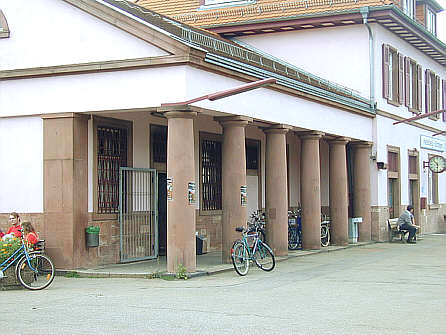 Bahnsteigseite des Bahnhofs Heidelberg-Kirchheim mit einer neoklassizistischen, noch vom Jugendstil beeinflussten Säulenreihe. Heute mit Glaswand verschlossen und einer neuien Nutzung zugeführt.