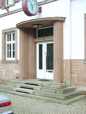 Ehemaliger Hauptzugang des Bahnhofs Heidelberg-Kirchheim mit flankierenden kannellierten neoklassizistischen Säulenvorlagen