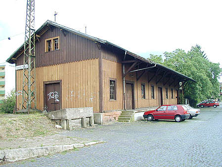 Ehemalige Güterhalle des Bahnhofs Heidelberg-Kirchheim mit straßenseitiger Laderampe