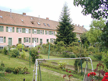 Gartenseite der Reihenhäuser mit dem jeweils zum Haus gehörenden Gartenstreifen