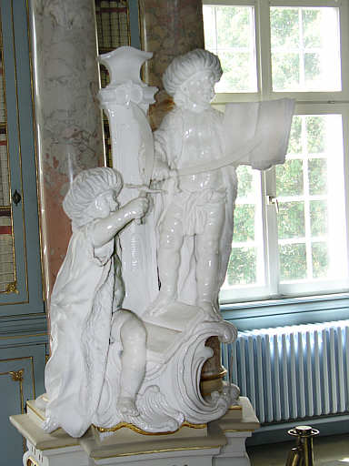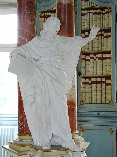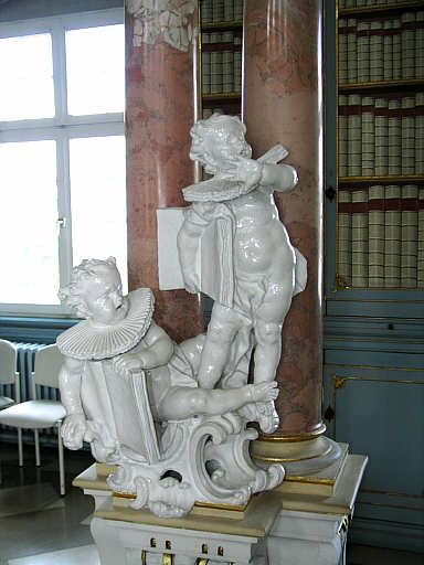 Vor den Doppelsäulen, die die Galerie tragen, stehen abwechselnd Figuren der Kirchenlehrer und der personifizierten Häresien. Während erstere einen würdigen und bewegten Eindruck vermitteln, sind letztere höfisch, die Eitelkeit betonend und zum Teil exotisch herausgeputzt. Beide Gruppen sind in Mimik und Gestus aufeinander bezogen.