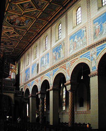 Stützenwechsel zwischen Pfeilern und Säulen mit Würfelkapitellen. Dreizoniger Aufbau mit Arkadenreihe, Bildfeld und Obergaden.