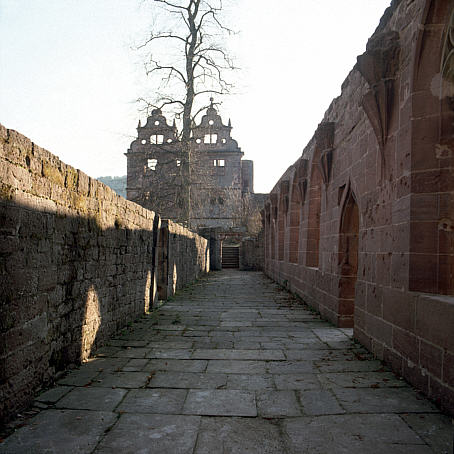 Blick aus dem Ostflügel des gotischen Kreuzgangs auf den Doppelgiebel des herzoglichen Schlosses.