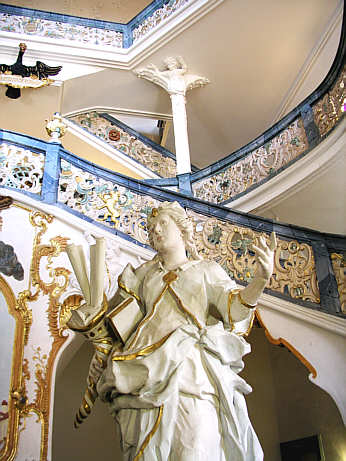 Am Fuß der Treppe zwei freistehende Figuren (Weisheit