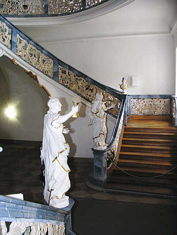 Treppenhaus, Christian Fluhr 1743 - 1746 Aufgang vom Parterre mit den beiden freistehenden Brüstungsfiguren der Weisheit und des Glaubens.