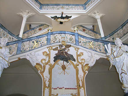 zweiläufigen Treppe. An der Brüstung links und