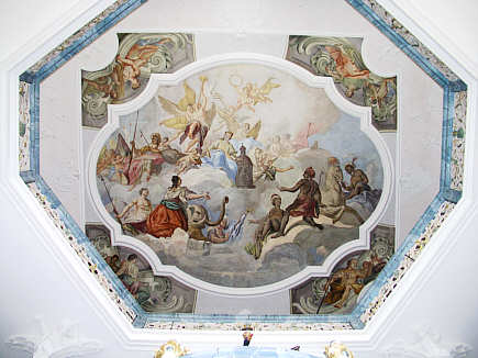 Treppenhaus, Christian Fluhr 1743 - 1746 Deckengemälde von Johann Baptist Ferradino, 1745, mit dem Triumph der Kirche. Dargestellt sind die 3 Erdteile Afrika, Asien und Amerika, die der Kirche ihre Verehrung erweisen.