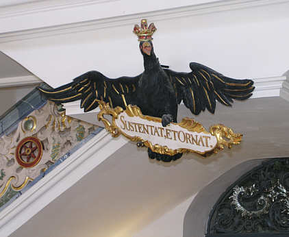 Treppenhaus, Christian Fluhr 1743 - 1746 Am Balkon des obersten Stockwerks ein Adler (Stuck) mit dem Schriftmaedaillon "Sustentat et ornat" (Er stützt und schmückt)