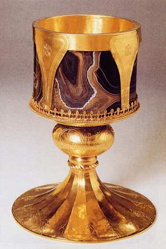 Kuppa: byzantinisch, 10. Jh. Die Schale diente ursprünglich zum Weingenuss bei Hoffeierlichkeiten und gehörte der Überlieferung nach dem heiligen Adalbert. Nach dessen Märtyrertod wurde sie zu einem Messkelch umgestaltet. Jüngste Forschungen belegen, dass sie eine der diplomatischen Gaben war, die Otto III. bei seinem Besuch in Gnesen mitbrachte. |