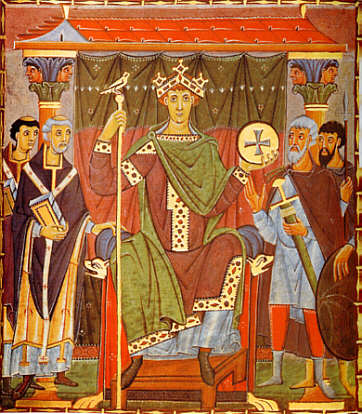 der Kaiser - Otto III. - in spätantiker Tradition, auf einem Thron mit