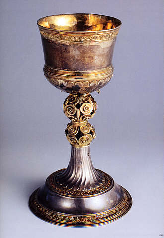 Silber, vergoldet, H. 22 cm, Mitte 9. Jahrhundert Antik sind an diesem Kelch nur die innen glatt vergoldete Kuppa und der obere Nodus. Das Stück ist ein beeindruckendes Zeugnis karolingischen Kunsthandwerks und wurde vermutlich als liturgischer Kelch in der Hofwerkstatt Karls des Großen hergestellt. Es könnte als Geschenk anlässlich der Taufe von 14 böhmischen Fürsten im Jahre 845 als Geschenk an den böhmischen Adligen gekommen sein, in dessen Grab die Stücke 1864 gefunden wurden. |