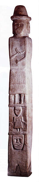 Herkunft Zbrucz bei Husjatyn (Ukraine) Der Pfeiler ist auf allen vier Seiten mit Reliefs bedeckt, die in drei Bildzonen - Himmel, Erde, Unterwelt - gegliedert sind. Die lebensgroße Götterfigur an der Spitze ist nach vier Seiten als vier Männer ausgearbeitet, die nach orientalischm Vorbild mit kaften und Gürtel bekleidet sind. Ihre vier Gesichter werden aber von einem einzigen Fürstenhut bedeckt. Auf drei Seiten zeigt sie mit Ring, Horn und Säbel die Attribute der göttlichen Macht. In einer niedrigeren Mittelzone stehen Männer und Frauen, die sich im Reigen die Hände reichen. In der Basiszone trägt ein bärtiger Athlet die Menschenwelt auf seinem Kopf. |