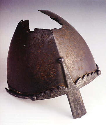 Prag, 10. Jh., H. 17,2 cm Der im Besitz der Przemysliden befindliche Helm düfte spätestens zur zeit Boleslavs II. dem heiligen Wenzel zugeschrieben worden sein, unter dem auch (um 992) der Nasenschutz mit dem Reifen dazukam. Dieser gehörte ehemals zu einem Helm nordeuropäischer Herkunft und zeigt stilisiert den an einen Baum gefesselten Odin. |