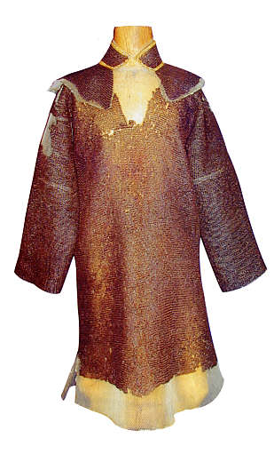 Böhmen (?), 1. Jahrzehnt 10. Jh., L. 104,5 cm Das Hemd besteht aus eisernen Drahtringen mit einer Drahtstärke von 0,75 - 0,8 mm. Der Kragen (Draht-Durchmesser 0,9 mm) ist als Hals von Goldringen gesäumt. Gesamtform, Ärmelschnitt und die lichte Weite der Ringe legen eine Herstellung im mitteleuropäischen Kreis, evt. von Handwerkern, die nach dem Fall Großmährens nach Böhmen geflüchtet waren |