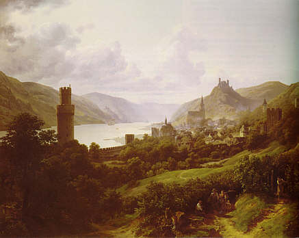 Typische Vedoute der Rheinromantik mit Burgen, Stadt und Fluss