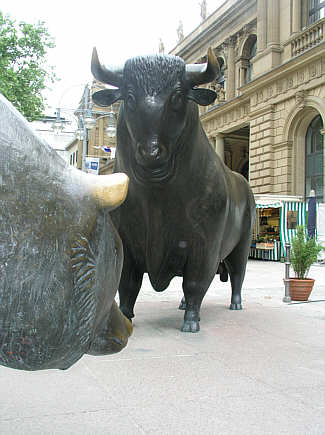 Bulle und Bär versinnbildlichen die beiden Zustände des Aktienmarktes. Der Bulle, der mit seinen Hörnern nach oben stößt, steht dabei für die Hausse, der mit seinen Pranken nach unten schlagende Bär für die Baisse im Aktienmarkt.