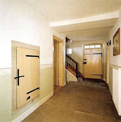 Hausflur im Erdgeschoss mit Sandsteinbelag und ehemaliger Kachelofenfeuerung (links). Im Hintergrund die Treppe und die zum Hof führende Haustür