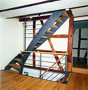 Aufgang vom Ober- zum Dachgeschoss, aus Raumgründen als Stahlwangentreppe mit Holzstufen verwirklicht.
