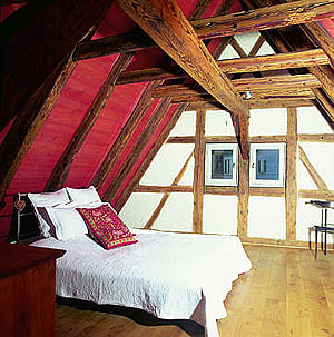 Im Sockelgeschoss, wo einst Schweine und Kühe zuhause waren, befinden sich heute die Wohnküche und weitere Räume - die außen sichtbaren Steinwände wurden belassen und nur von innen gedämmt, eine Wandheizung sorgt für angenehme Wärme. Eine neue Treppe in leichter Stahlkonstruktion fügt sich harmonisch in das historische Erscheinungsbild der alten Böden und Wände sowie ins Dachgeschoss mit seiner sichtbaren Sparrenkonstruktion ein.