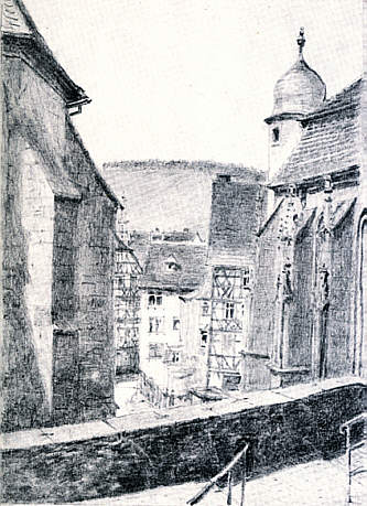 Durchblick zwischen der Chorwand der evang. Kirche (links) und der Längswand der Kilianskapelle (rechts) zum Marktplatz