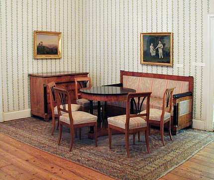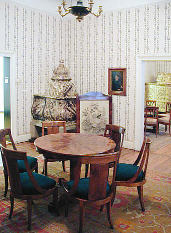 Wohnstube des Biedermeier Tisch und Stühle Nussbaumfurnier Im Hintergrund Ofen mit Rokoko-Ornamentik, Fayence