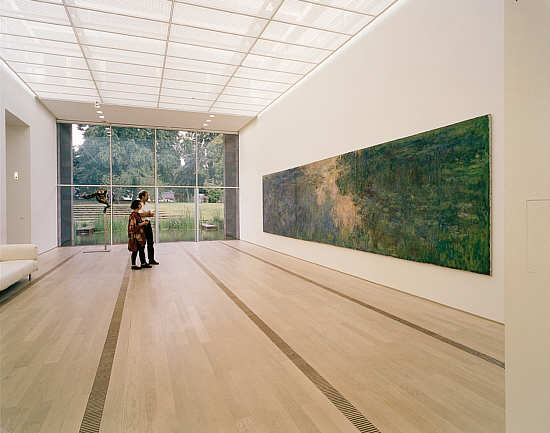 Zwischen den Längsmauern sind die Ausstellungsräume der Sammlung mit einem wohlproportionierten Raster untergebracht, welches jedoch immer wieder verändert wird. Ebenfalls existiert keine strenge, lineare Saalfolge, sondern eine ungefähre Besucherlenkung. Eine weitere Spezialität der Fondation Beyeler sind die vollkommen ruhigen, durch keine technischen und gestalterischen Details gestörten Präsentationsräume. Wand, Decke und Boden mit Parkett aus heller französischer Eiche sind sensibel aufeinander abgestimmt.