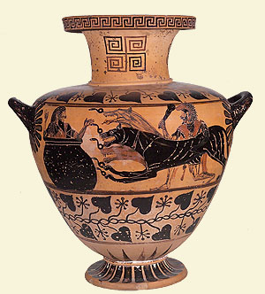 Unten: Schwarzfigurige Amphora mit Signatur des Nikosthenes