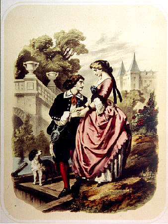 Weissenburger BilderbogenEine Ausstellung im Badischen Landesmuseum in KarlsruheBilder für das Wohnzimmer: Vergißmeinnicht (nach 1869) Abschiedsszene eines jungen Paares in parkähnlicher Umgebung mit einem Schloss im Hintergrund. Der Mann ist im Begriff, einen Kahn zu besteigen, in dem der Hund, das Symbol der Treue bereits wartet. Bad. Landesmuseum Karlsruhe, Kat. Nr. 108 |