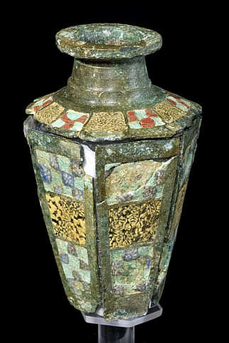 Bild: Sechskantiges Bronzefläschen mit Emailverzierung