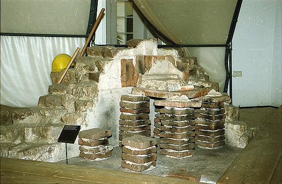 Aufbau einer römischen Hypokaustheizung mit Ziegelplatten-Pfeilern, Tragplatten, Estrich und Wand-Tubuli