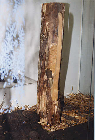 Auf ein Knieholz montierte neolithische Axtklinge. Installation mit einem angehauenen Baumstamm.