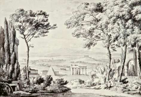 Franz Kobell (1749 – 1822) Römische Phantasie-Landschaft, um 1780 Feder in Schwarz, Lavierungen in Bister © rem