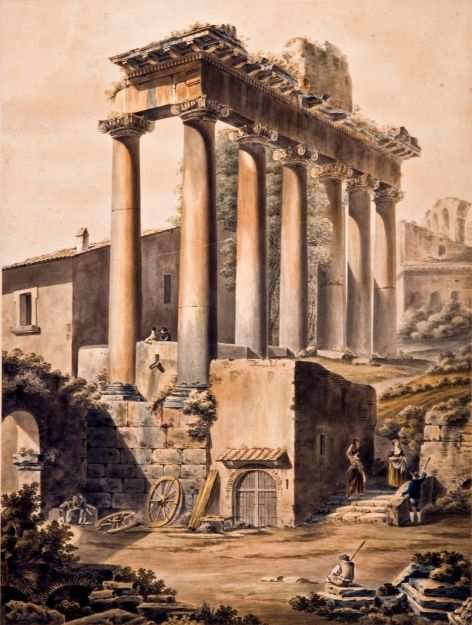 Maximilian von Verschaffelt (1754 – 1818) Ruinen des Saturn-Tempels auf dem Forum Romanum, um 1785 Feder und Tusche in Schwarz, farbig aquarelliert © rem