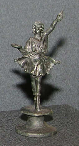 2 bronzene Larenstatuetten in der traditionellen tänzelnden Haltung aus dem Haus des Oppius Gratus (IX, 6, 5)