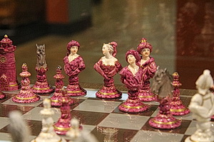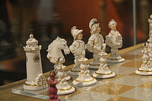 Unten: Schachspiel. Höhe 5 cm (Bauern), 8,5 cm (König). Modell von Franz Conrad Linck, um 1765. Erworben 1924 mit der Sammlung Beer