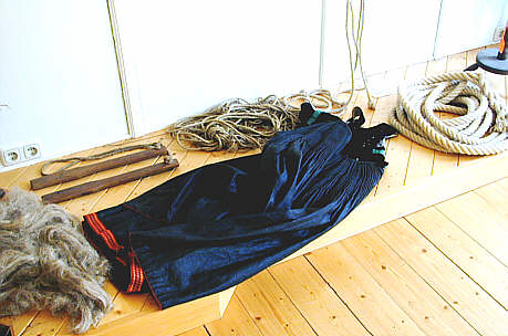 am Boden liegend: blau gefärbtes Leinenkleid, dahinter verschiedene Hanfstricke, rechts ein Seil, wie es zum Abtransport des Holzes aus dem Wald verwendet wird.