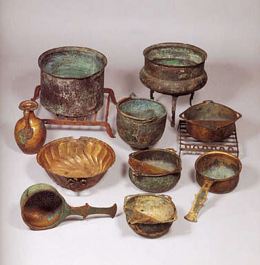 Vorn links und rechts eine Schöpfkelle mit Sieb, wie zum Schöpfen des Weins aus dem Eimer bzw dem Fass benutzt wurden und sehr häufig paarweise vorkommen. Dahinter Gefäße aus Bronze. Hortfund von Otterstadt-Angelhof
